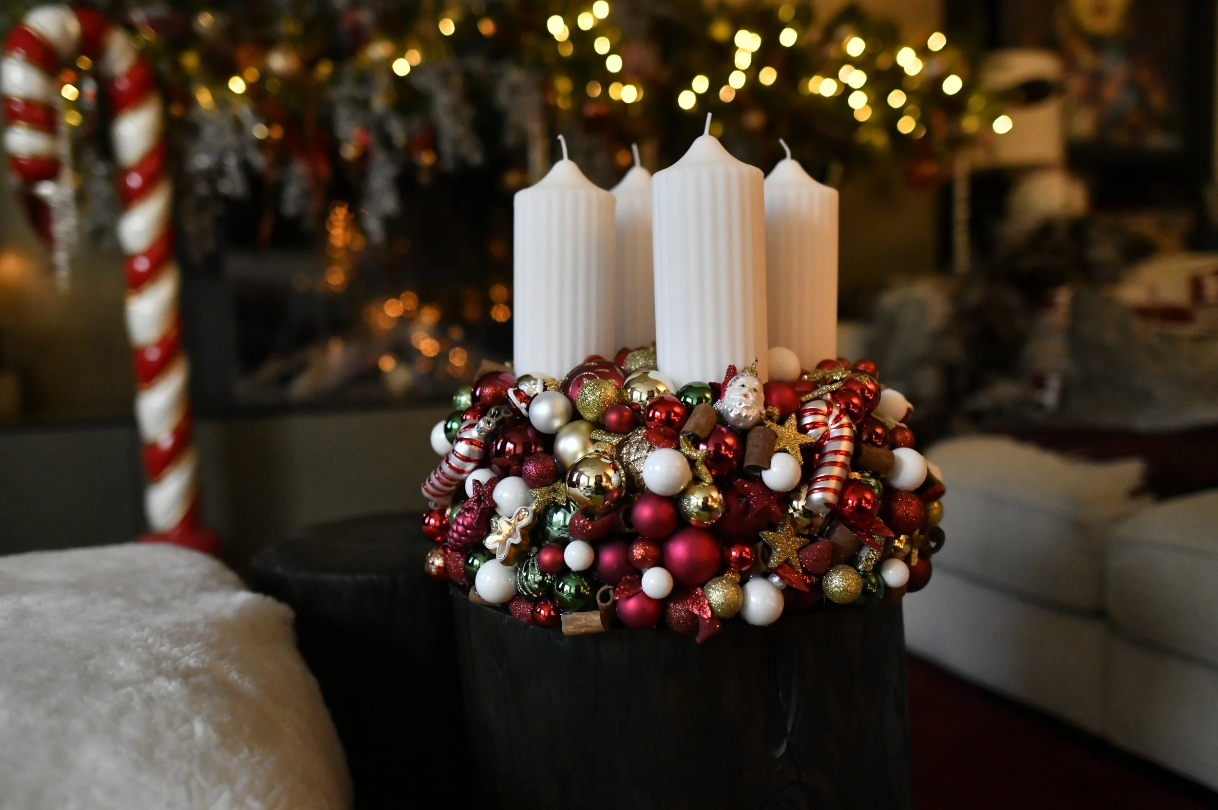The Adventkranz, It is meticulously hand made and crafted solely with an array of stunning Christmas balls and decorative elements, as well as natural winter elements like cinnamon, pine cones and star anise, s ensuring that it will grace your home for many joyful Christmas seasons to come.